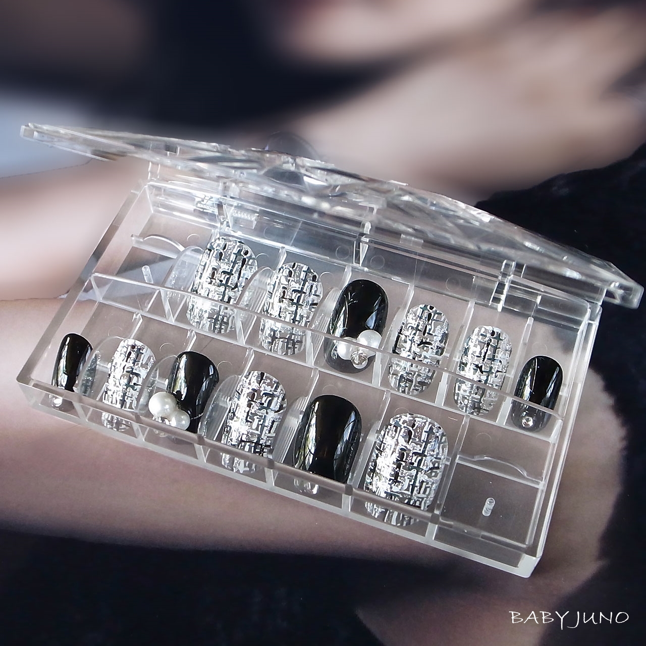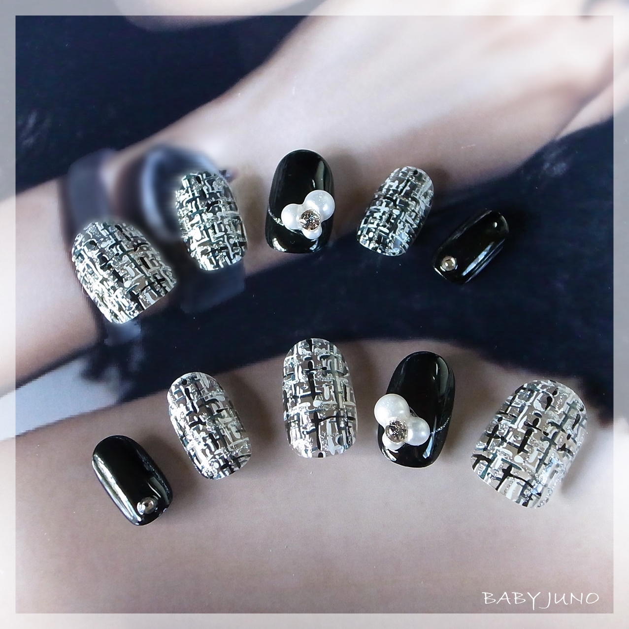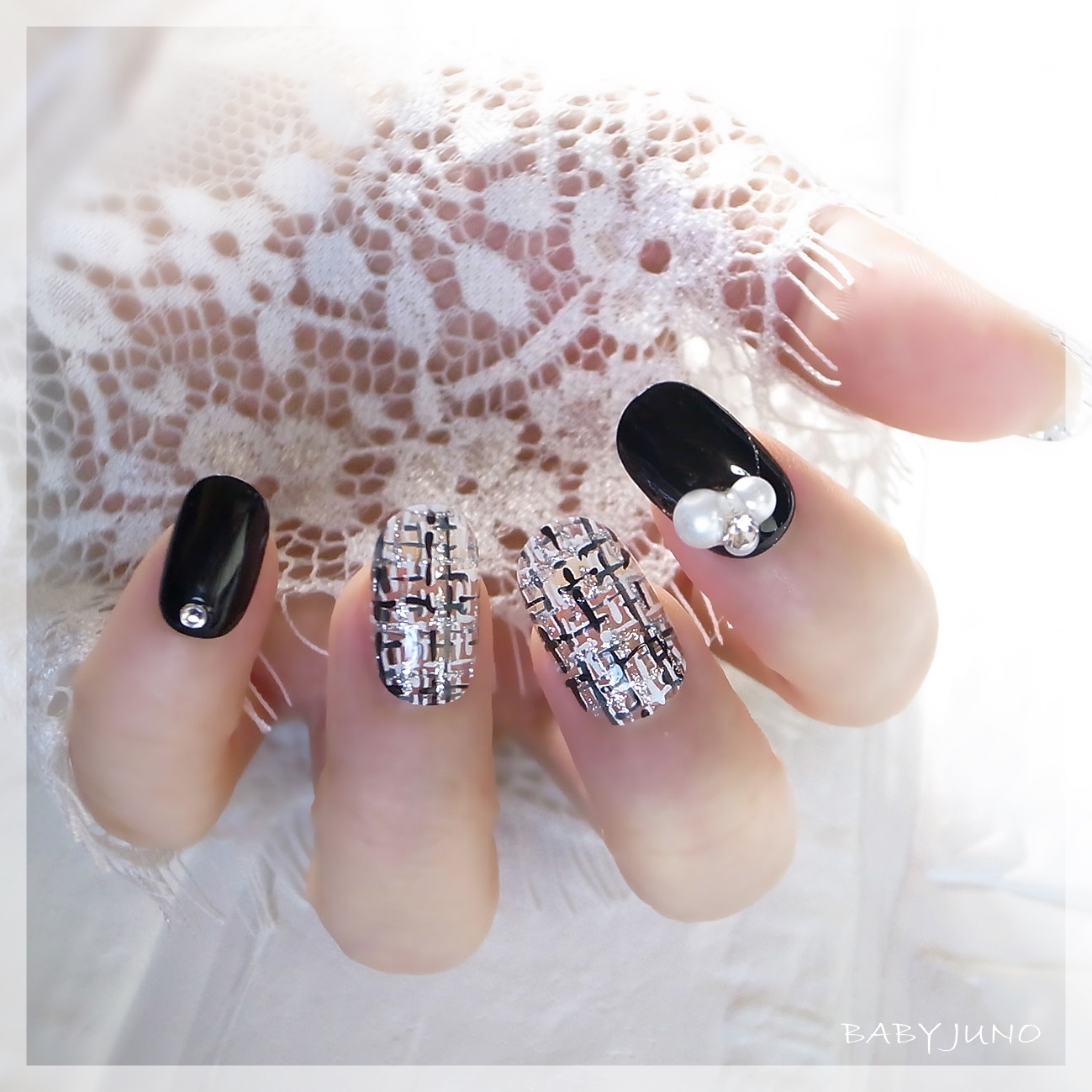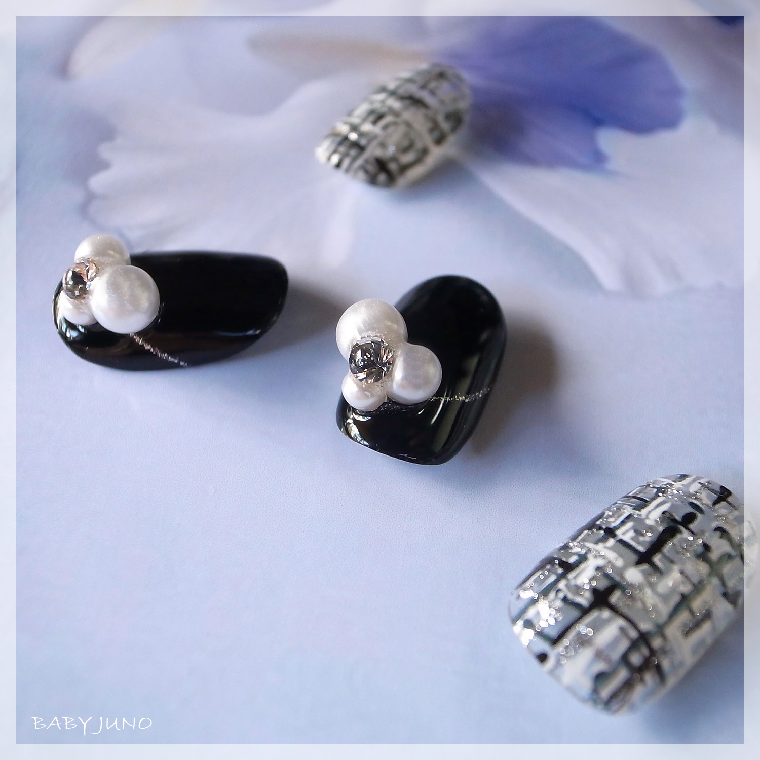 大き目のパールを丸のまま3粒デコレーション。トップにクリスタルを仕込み、ネックレスラインをシルバーのラメで描きました。 黒の分量を2チップづつに調整して、上品なツイードチップを多めにした、上品さと輝きのある大人のブラックネイルに仕上げました。 *インスタの掲載はこちら!